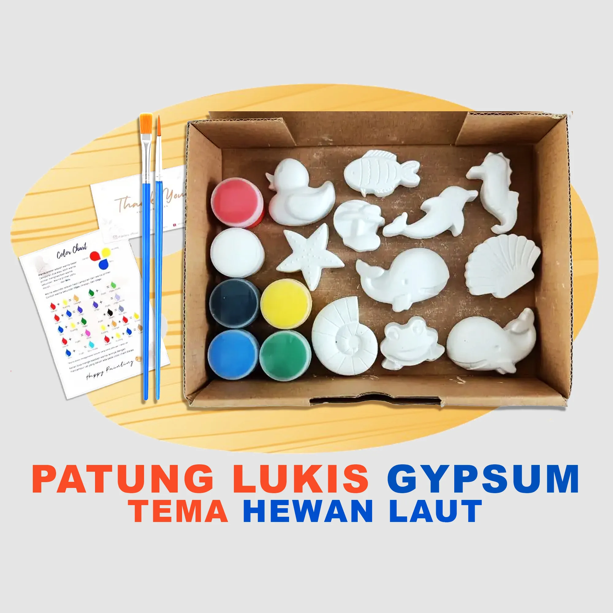 - 11 Pcs patung gypsum - 6 Pcs cat Air - 2 Pcs kuas lukis (Ujung rata & lancip) - 1 Lbr color chart - Sudah dikemas dalam box ukuran 15 x 20 x 5 cm